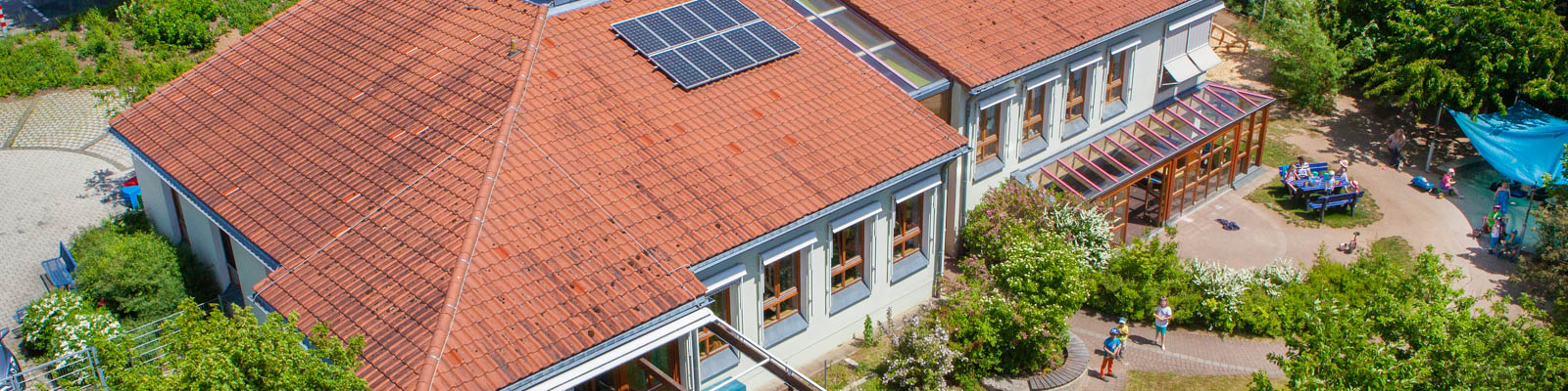 Das Erdgeschoss gliedert sich in 3 nebeneinander liegenden Gruppenräume mit direkt angeschlossenem Intensivraum und Abstellraum. Waschraum mit Dusche für die Kinder befinden sich in nächster Nähe. Auch eine Wickelmöglichkeit für den Krippenbereich ist vorhanden. Für das Personal stehen das Büro und die Küche zur Verfügung. Der großzügig gestaltete Eingangsbereich von 70 qm bietet einen zusätzlich Spiel- und Freiraum für die Kinder.